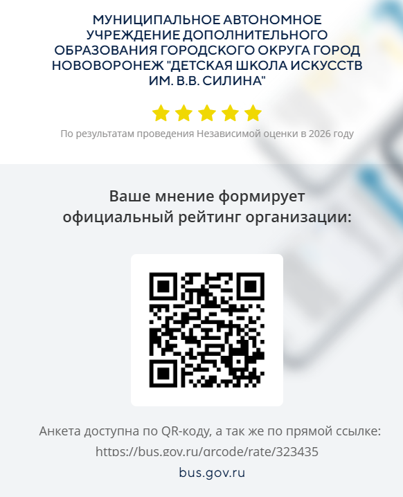 Образовательное учреждение «Детская школа искусств им. В.В. Силина» находится по адресу: г. Нововоронеж, ул. Космонавтов, д. 20.