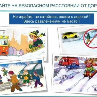 Соблюдайте правила дорожного движения. Помните, что зимняя дорога опасна. Не играйте близи проезжей части дорог, ж/д полотна, водоёмах; не выходите на лёд.